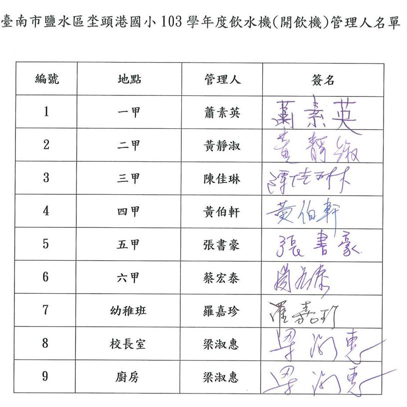 臺南市鹽水區坔頭港國小103學年度飲水機(開飲機)管理人名單